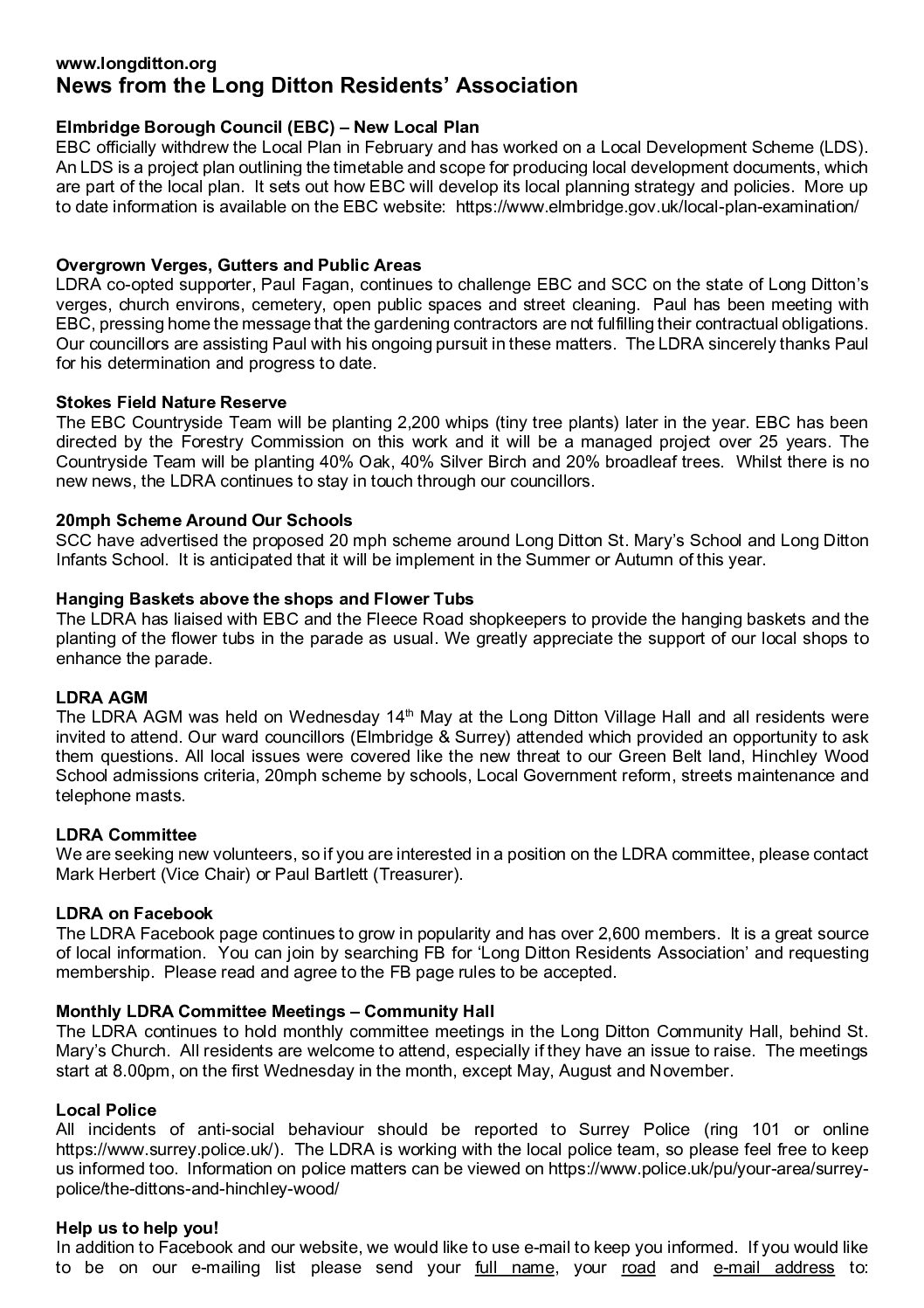 Put another way, the LDRA tries to make Long Ditton a better place in which to live. It plays an active role in all planning matters that affect Long Ditton and is in continuous contact with Surrey and Elmbridge Councils on a wide variety of other issues, including traffic, recreation areas and rubbish collection.